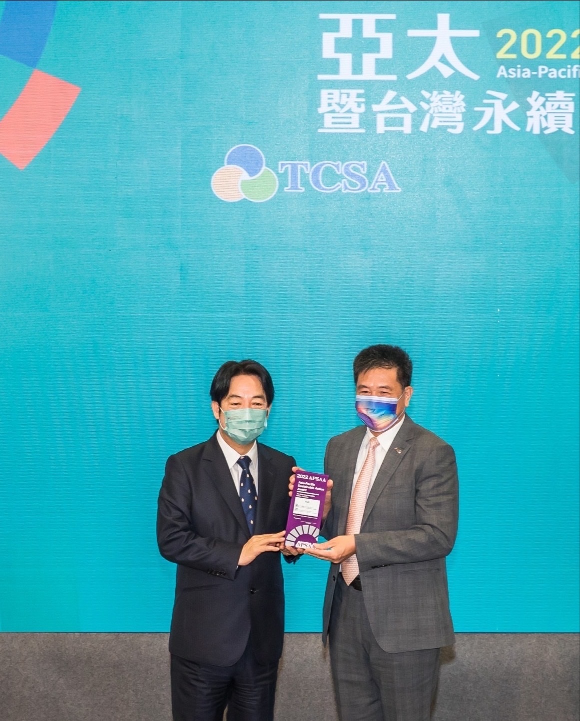友達以卓越永續績效表現,在第一屆亞太永續行動獎獲得肯定,由副總統賴清德頒獎(左),友達光電董事長暨執行長彭雙浪(右)代表領獎